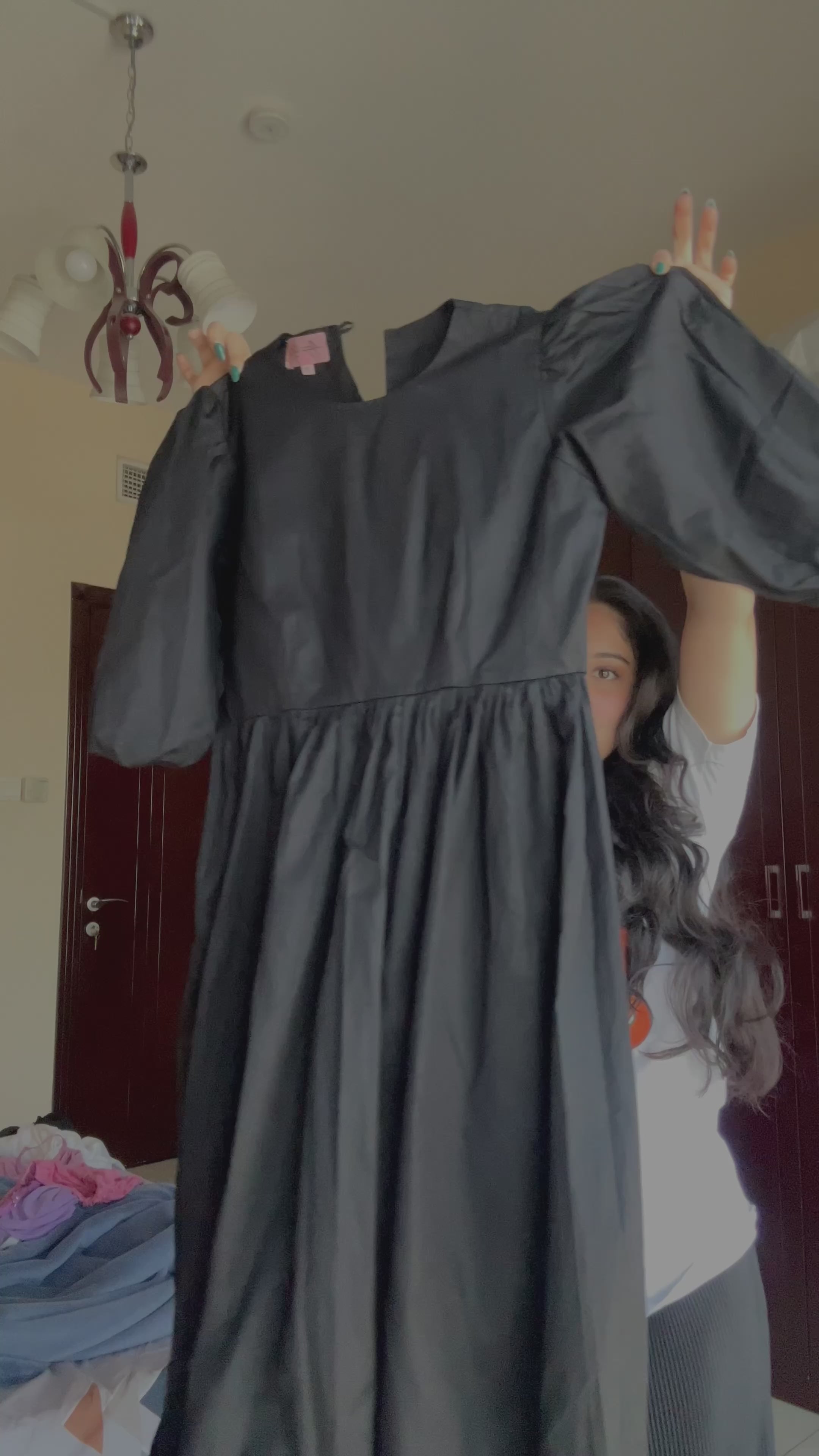 A charming black puff dress makes it an elegant choice for a timeless and graceful look. This dress with details exudes culture and style, making it a versatile and fashionable option for various occasions.